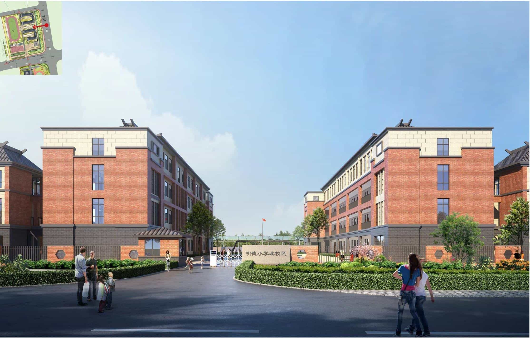 学校总体布局采用“两轴”,“五区”,“多个庭院”规划形式。